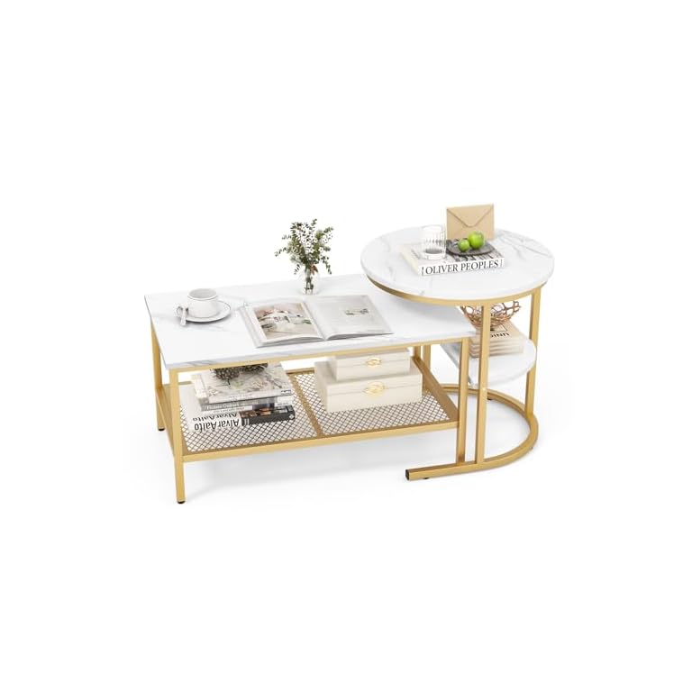COSTWAY 2er Set Couchtisch, Beistelltisch Marmor Optik mit Metallrahmen & Ablage, Kaffeetisch Wohnzimmertisch Sofatisch für Wohnzimmer, Schlafzimmer (Weiß + Golden)