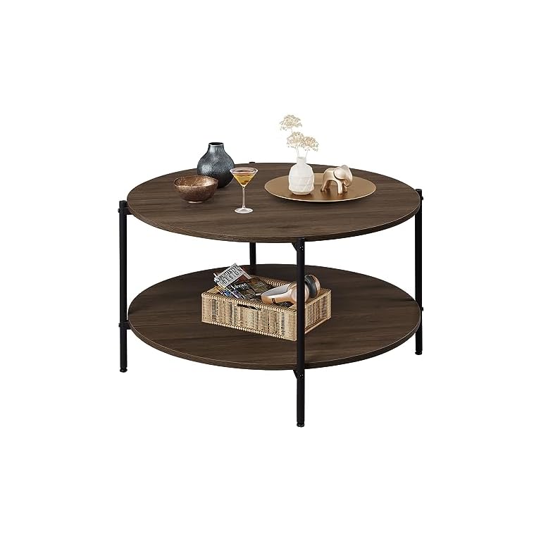 Couchtisch Rund mit 2 Ebenen, Wohnzimmertisch Holz, Stubentisch mit Metallrahmen, für Wohnzimmer, Schlafzimmer, Modern Design, Braune Walnuss