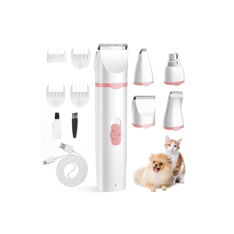 4in1 Leise Hundeschermaschine für Kleine & Mittelgroße Hunde Katzen, Usb Aufladbar Pfotentrimmer für Hunde mit 4 Abnehmbare Multifunktions-Schneidköpfen für Augen/Ohren/Pfoten/Nagel (Rosa)